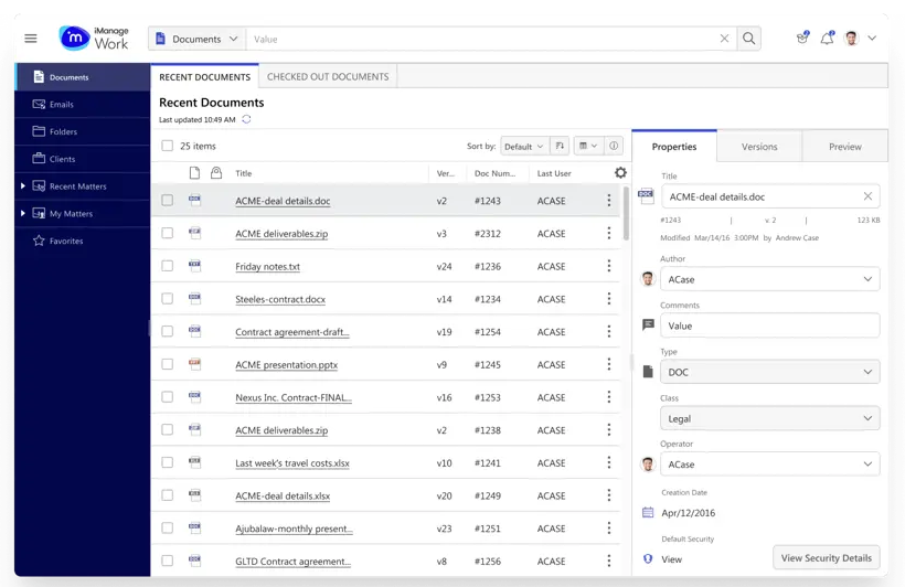 O conhecimento é fundamental para o sucesso dos escritórios de advocacia globais. O iManage ajuda os principais escritórios de advocacia do mundo a gerenciar documentos com mais eficiência, proteger ativos de informações vitais e alavancar seu conhecimento em escala global.