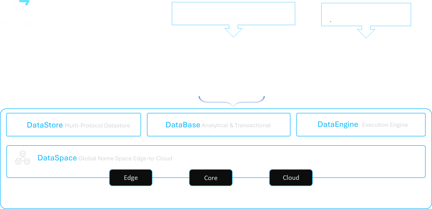 - VAST DataSpace fornece o namespace global para acesso a dados da borda à nuvem. Ao quebrar o compromisso entre consistência estrita e desempenho local, o DataSpace torna possível computar dados de qualquer plataforma de nuvem pública, privada ou de borda.