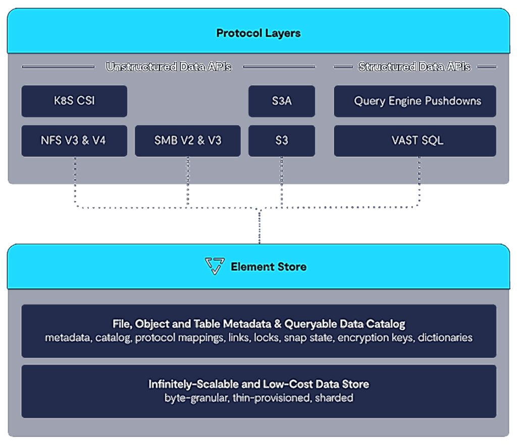 Todos os protocolos VAST são escritos internamente para fornecer a melhor experiência de desempenho e permissões. Ao possuir e controlar toda a pilha, cada protocolo foi projetado para funcionar perfeitamente com o namespace abstrato chamado de Element Store. Com o VAST, todos os protocolos compartilham acesso igual aos dados e desfrutam de acesso igual ao desempenho.
