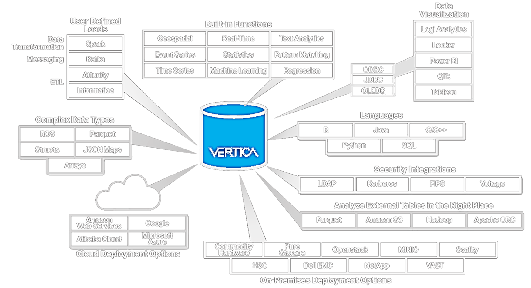 - Data Lakehouse. Analisa dados onde quer que eles residam (HDFS ou Cloud Object Storage) e em todos os formatos populares (ORC, Parquet, AVRO, JSON ou ROS (Vertica nativo)) para que os usuários possam obter insights com mais rapidez e eficiência.